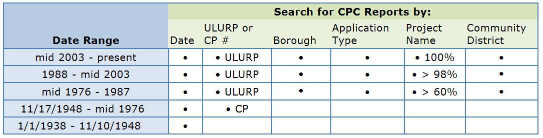 From mid-1976 to the present, CPC reports are identified by ULURP number and each report is contained within its own pdf document. In addition, in some cases, as noted in the above chart, the reports may also be retrieved by searching for Application Type, Project Name, or Community District.
